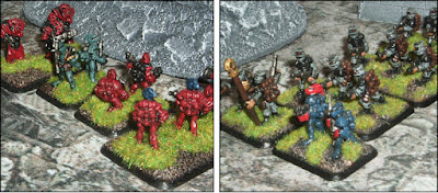 The Imperial Guard infantry continued to fire upon the demon warriors, and those who didn't fail to keep their terror in check managed to score more injuries upon the cruel denizens of the Warp. However, it was clear that they still needed to claim more objectives, so led by their commander, some of the heavy weapon teams pressed further west towards both the enemy's lines and Objective Three [Ruined Tower].