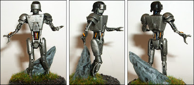 Robocop 2 was primed with "Citadel" Abaddon Black and then treated to a couple of layers of Scalecolor Thrash Metal by "Scale 75". I went with this particular metallic as I wanted the cyborg to appear a little different in hue to the (smaller) incarnation of FKMSA Failed Experimental Battledroid Series 1 I'd previously pigmented. The 3D print was then drowned in "Citadel" Nuln Oil - the new formula version which I'm still somewhat getting my head around using. The entire ensemble was later dry-brushed with (more) Thrash Metal by "Scale 75".