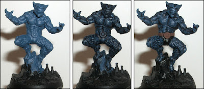 The founding member of the X-Men was then layered in pure "Vallejo" Heavy Blue, before being drenched in plenty of "Citadel" Drakenhof Nightshade and dry-brushed with (more) "Vallejo" Heavy Blue. I next carefully 'picked out' the hairy mutant's belt with a couple of coats of Skulker Yellow by "Two Thin Coats", and ensured that any flat areas still allowing some of the "Vallejo" Heavy Blue to show through were subsequently given a lick of "Two Thin Coats" White Star.